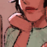 Pink streaked hair in a messy bun. green skin. Paint smattered.